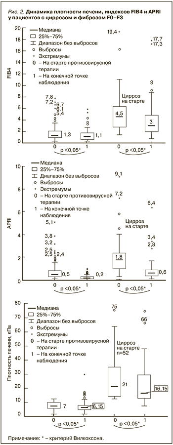Проведена оценка динамики изменения плотности печени, индексов FIB4 и APRI у пациентов с циррозом и фиброзом F0–F3 (рис. 2).