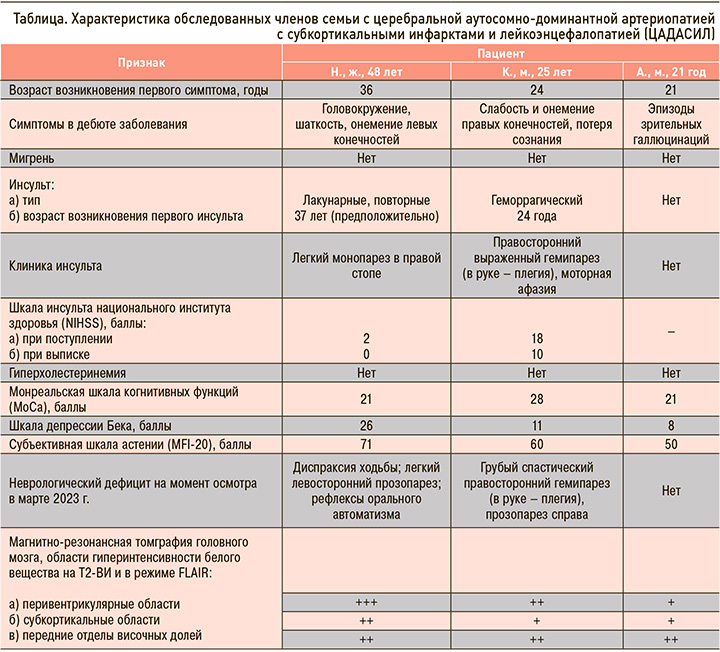 Анализ истории болезни и результатов обследования трех пациентов из двух соседних поколений описанной семьи выявил как сходство, так и индивидуальные различия проявлений ЦАДАСИЛ.