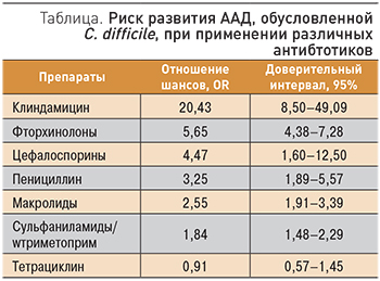 В связи с широким использованием антибиотиков терапевты должны помнить о возможности развития псевдомембранозного колита, самой тяжелой форме антибиотико-ассоциированной диареи (ААД), обусловленной микроорганизмом Clostridium difficile. Согласно дефинициии, ААД характеризуется наличием 3-х эпизодов неоформленного стула или более в течение 2-х последовательных дней или более, развившихся на фоне или в течение 2-х мес после применения антибактериальных препаратов. C. difficile служит этиологическим фактором нозокомиальной ААД в 15–25% случаев. К факторам риска развития диареи относят использование антибиотиков широкого спектра действия и индивидуальные особенности пациента (пожилой возраст, хронические заболевания, контакт с нозокомиальными [внутрибольничными] патогенами) [6]. Мета-анализ, в который были включены более 30 000 пациентов с доказанной внебольничной клостидиальной ААД, позволил выделить антимикробные препараты и группы препаратов, ассоциирующиеся с максимальным риском данного осложнения (таблица) [7].