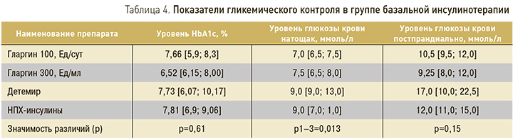 Анализ различной терапии в группе базис-болюсного режима лечения показал, что применение базального инсулина гларгин 300 Ед/мл давало некоторые преимущества по контролю гликемии натощак по сравнению с НПХ-инсулинами и детемиром (р=0,048). Однако значимых различий между подгруппами по среднему уровню HbA1c, тощаковой и постпрандиальной гликемии выявлено не было (табл. 3).