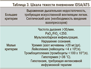 Экстренная госпитализация в отделение интенсивной терапии рекомендуется пациентам с гипотензией, требующей вазопрессорной поддержки, или дыхательной недостаточностью, требующей проведения искусственной вентиляции легких (ИВЛ): СР – сильная, УКД – низкий [14, 17, 18]. Для остальных пациентов эксперты РГ-ВП предлагают использовать малые критерии шкалы IDSA/ATS (табл. 3) для определения стратегии более интенсивного лечения. Наличие трех и более малых критериев может потребовать госпитализации в отделение интенсивной терапии: УКД – низкий [17].