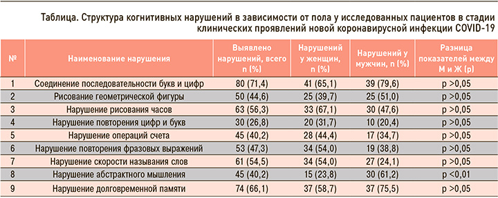 В последнее время появляется все больше данных, свидетельствующих о том, что COVID-19 способен вызывать серьезные когнитивные и эмоциональные нарушения [14]. По данным систематических обзоров и метаанализа более чем 1900 международных исследований, наиболее часто у пациентов встречались следующие нейропсихологические и эмоциональные нарушения в периоде клинических проявлений новой коронавирусной инфекции COVID-19: нарушения сна – 63,0% (43,8–80,4), тревожность – 35,7% (27,6–44,2), нарушение концентрации внимания – 38,2% (29,0–47,9), нарушение памяти – 34,1% (26,2– 42,5), снижение настроения – 32,6% (24,7–40,9), эмоциональная лабильность – 29,4% (15,8–32,3) [15]. Несмотря на многочисленные исследования, на сегодняшний день существует дефицит в представлениях о характере и структуре нейропсихологических и эмоциональных нарушений у пациентов в периоде клинических проявлений COVID-19.